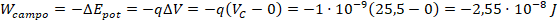 El trabajo que debemos realizar contra el campo es pues: Wnosotros = -Wcampo = 2,55·10-8 J El resultado positivo es coherente con el hecho de que para traer una carga positiva desde el infinito deberemos realizar un trabajo contra las fuerzas del campo creado por las cargas 1 y 2, también positivas También se podría resolver calculando primero la energía potencial de la carga de 1 nC en la posición C y luego obtener el trabajo y después el potencial en dicho punto |