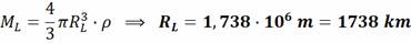 c) Como en el apartado anterior debemos pasar el valor de la densidad a unidades de S.I.: ρ = 3,34 g/cm3 = 3340 kg/m3 Ahora calculemos el radio promedio de la Luna mediante la definición de densidad y recordando el volumen de una esfera: El valor de la aceleración de la gravedad en la superficie será el de la intensidad de campo gravitatorio, es decir: Recuerda que las unidades de intensidad de campo gravitatorio (N/kg) y las de aceleración (m/s2) son equivalentes |