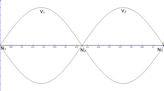 Con lo que las posiciones de los 3 vientres serán: V1 = 12,5 cm V2 = 37,5 cm V3 = 62,5 cm (en la mitad de las 3 partes iguales en que queda dividida la cuerda) |