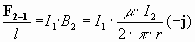 Supongamos que los dos conductores son perpendiculares al plano del papel de modo que la intensidad I1 sale del papel (+k) y la intensidad I2 entra en el papel (-k). Calculamos el campo magnético B1 que crea el conductor por el que circula una intensidad I1 sobre el conductor 2 situado a una distancia r :