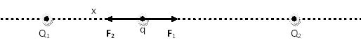 A 4,5 cm de Q1 c) Si acercamos ligeramente la carga q a Q1, esta repelerá con más intensidad a q y a la vez Q2 la repelerá con menos por alejarse de ella. El resultad será una pequeña fuerza neta hacia la posición inicial, por lo que regresará a su posición inicial. Pero al llegar a ese punto tendrá una cierta velocidad por lo que sobrepasará ese punto donde se anulan las fuerzas y continuará hacia Q2, pero entonces ocurrirá lo contrario: la repulsión de la carga 2 será mayor y la de la 1 menor con lo que aparecerá una fuerza resultante hacia la posición inicial, lo que hará que llegue a detenerse y volver sobre sus pasos reiniciando el ciclo. Por tanto el movimiento será de tipo oscilatorio (vaivén) en torno al punto de equilibrio, como suele ocurrir cuando el equilibrio es estable NOTA: NO podemos decir que sea movimiento armónico simple al no ser la fuerza directamente proporcional al desplazamiento de la posición de equilibrio sino una dependencia más compleja |