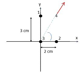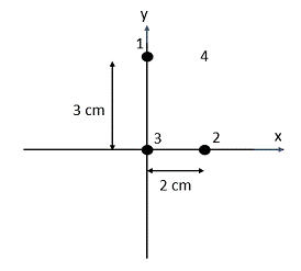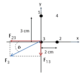 a) Calcula la fuerza electrostática total (módulo y ángulo) que hacen las partículas 1 y 2 sobre la partícula 3. b) Calcula (módulo y ángulo) y dibuja el campo electrostático que crea la partícula 3 en el punto 4, situado en el punto (2cm, 3 cm). c) Explica el concepto de campo electrostático y da la expresión del campo creado por una carga puntual +q a una distancia r.
