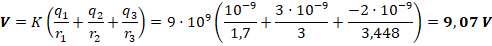c) Para anular ese potencial deberemos colocar una carga q4 a una distancia r. Obviamente esa carga debe ser negativa para crear en el origen un potencial de – 9,07 V. Calculemos esa distancia: