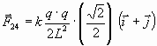 Para calcular el módulo de cualquiera de estas 4 fuerzas, que será el mismo dada la simetría, debemos obtener en forma vectorial, por ejemplo para la carga que se encuentra en el vértice 4, las fuerzas que ejercen las 3 restantes y sumarlas.