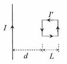 2. Por un conductor rectilíneo e indefinido circula una corriente eléctrica de intensidad I = 2 A. Se sitúa una espira cuadrada de lado L = 5 cm a una distancia d = 10 cm tal y como indica la figura. Si por la espira circula una corriente I’ = 3 A en el sentido indicado, calcula la fuerza F (módulo, dirección y sentido) que ejerce la corriente I sobre el lado de la espira más próximo al conductor rectilíneo.