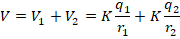 Donde r1 y r2 son las distancias al punto C de las cargas