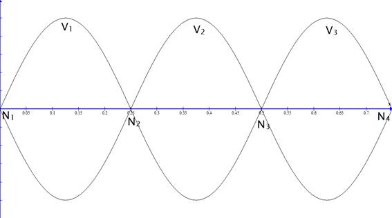 Con lo que las posiciones de los 3 vientres serán: V1 = 12,5 cm V2 = 37,5 cm V3 = 62,5 cm (en la mitad de las 3 partes iguales en que queda dividida la cuerda) |