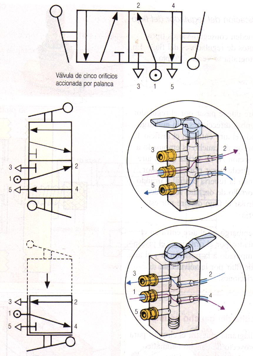 No tengas en cuenta la mitad superior del símbolo durante un momento. La mitad inferior indica las conexiones dentro de la válvula cuando la palanca está en una posición determinada. Ahora no tengas en cuenta la mitad inferior del símbolo, e imagina que cuando se mueve la palanca a la otra posición, la mitad superior del símbolo se desliza sobre la mitad inferior. Esto indica las conexiones que hay ahora dentro de la válvula. Observa que aparece un símbolo de "palanca" en ambos extremos del símbolo de la válvula de cinco orificios o vías. Esto es algo confuso: solamente hay, por supuesto, una palanca en la válvula real. |